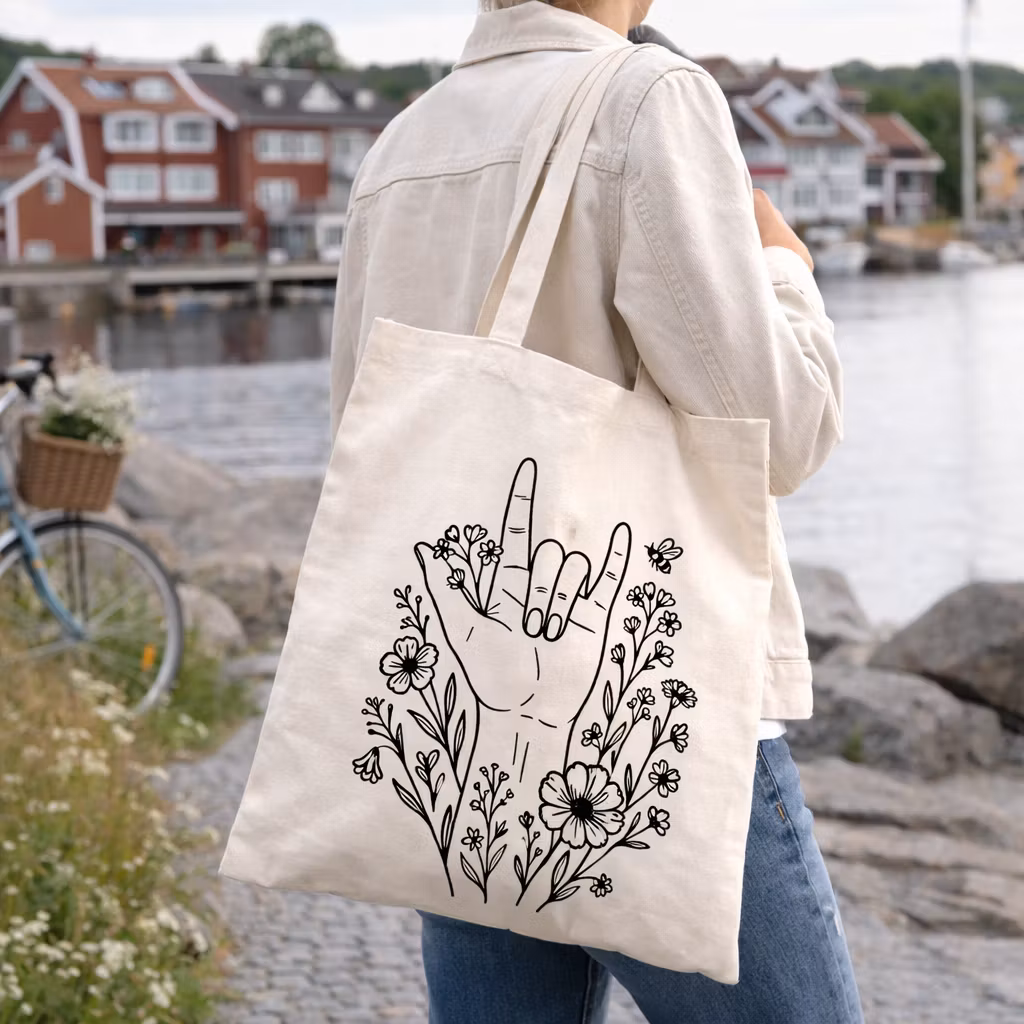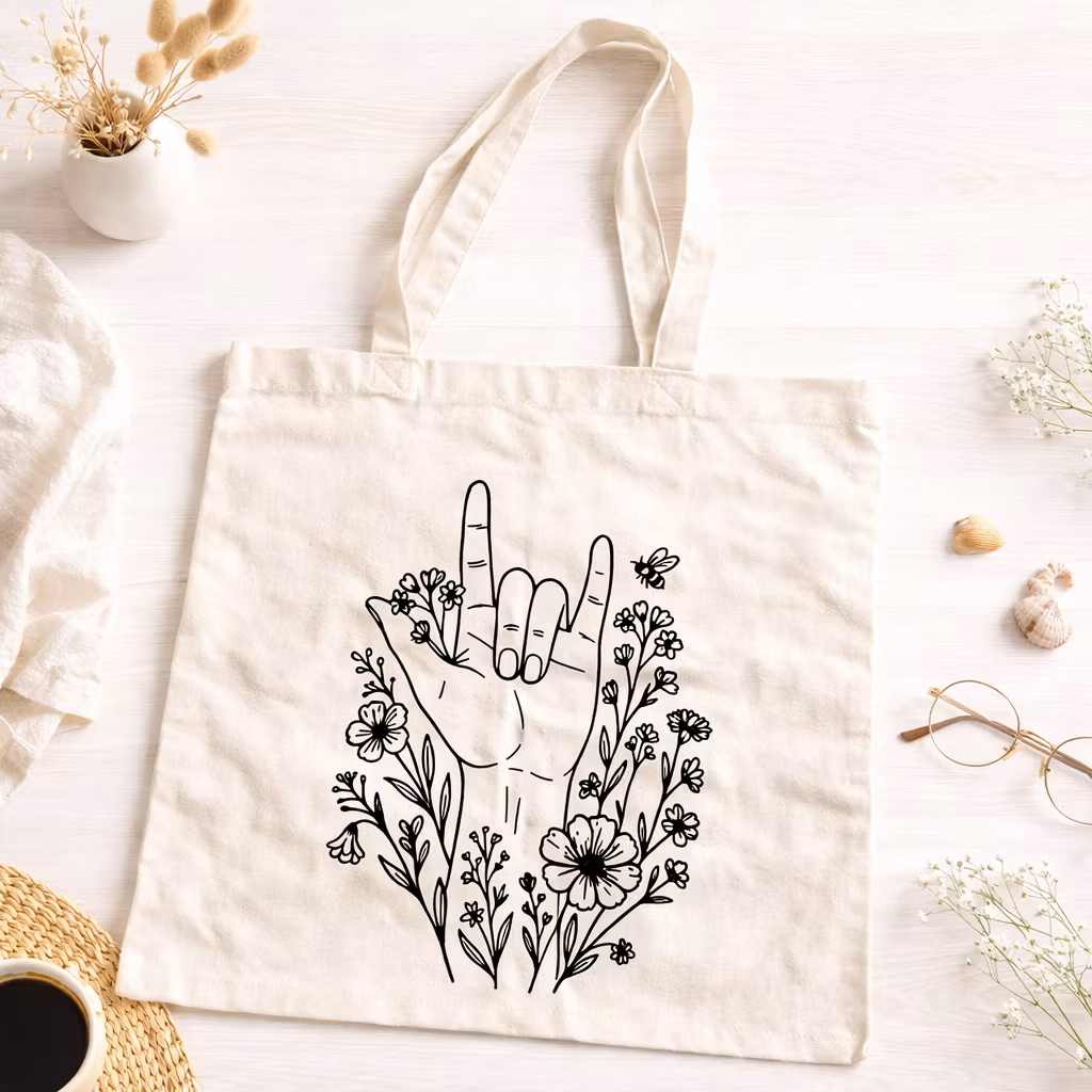 Motivet föreställer det välkända “I love you”-tecknet på teckenspråk, designat av mig med inspiration från både enkelhet och uttryck. En symbol för kärlek, gemenskap och inkludering.